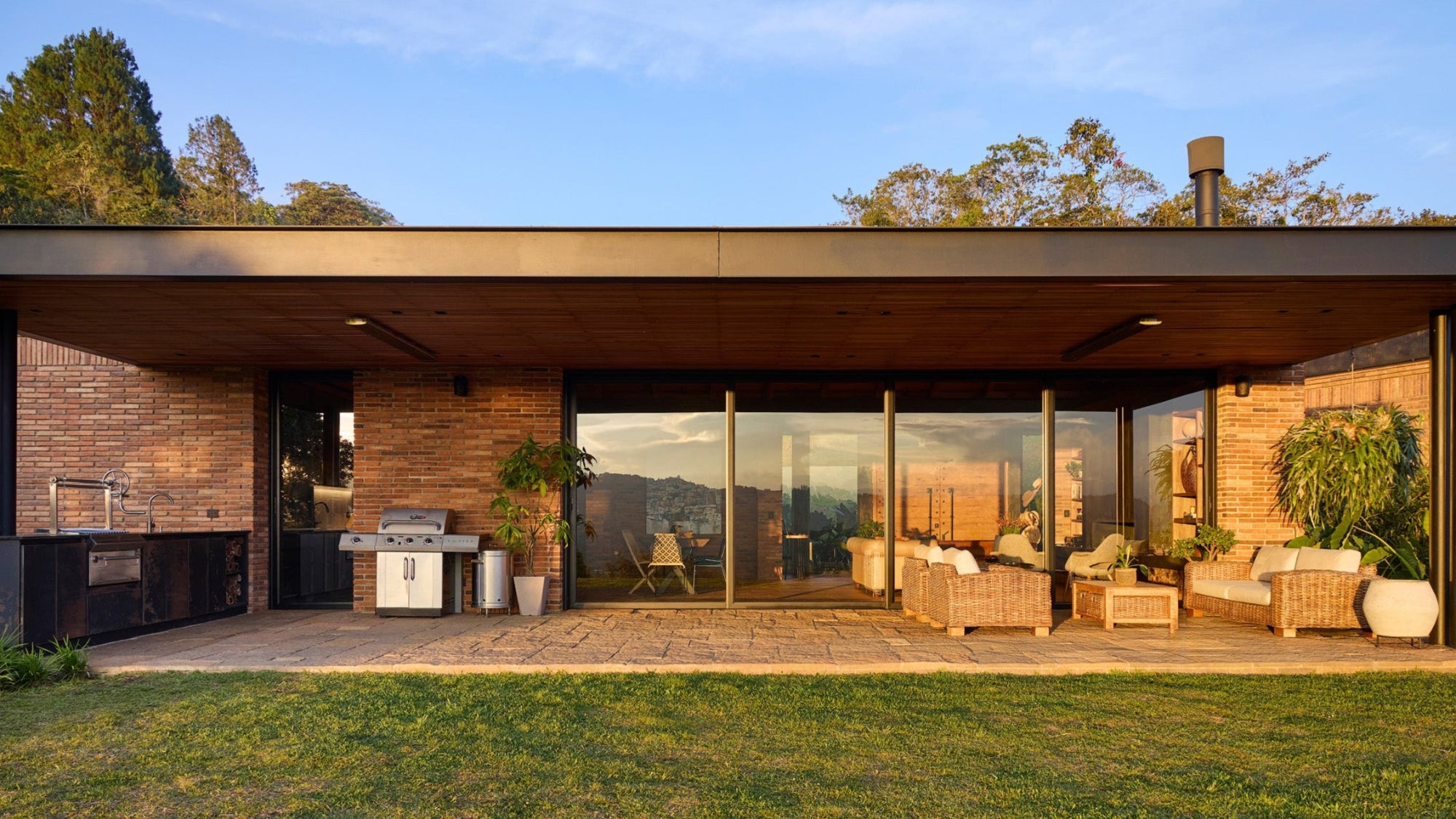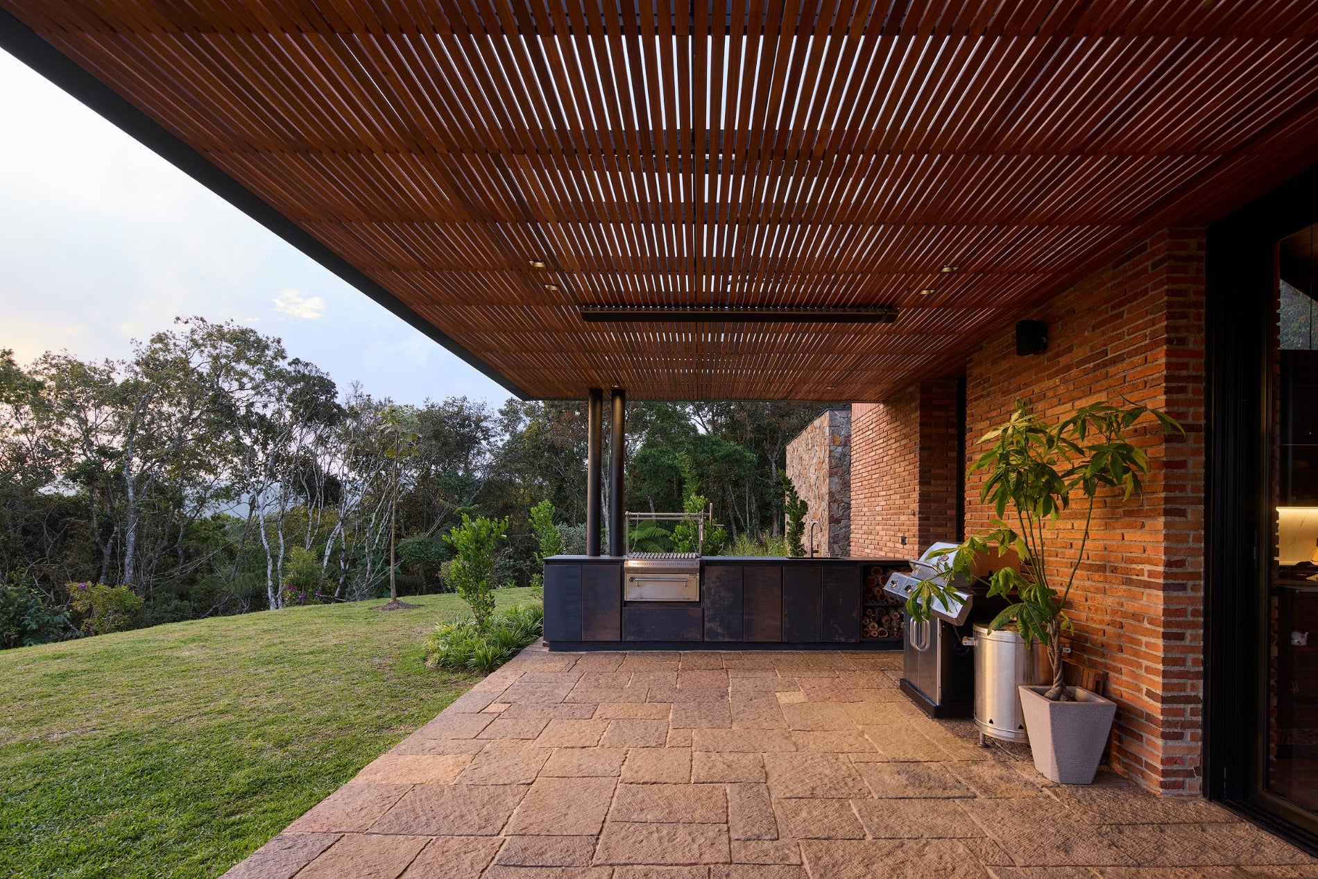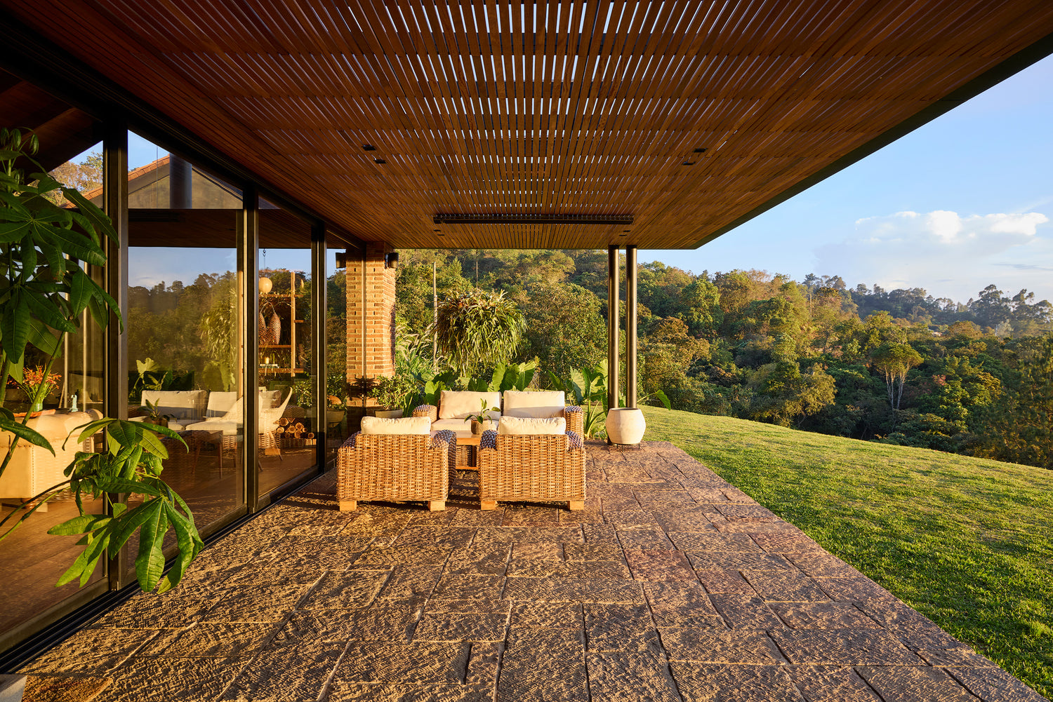 Esta pérgola de madera combina diseño y funcionalidad, creando un refugio acogedor en armonía con su entorno. Su estructura de listones filtra la luz, generando un juego de sombras que embellece el espacio.